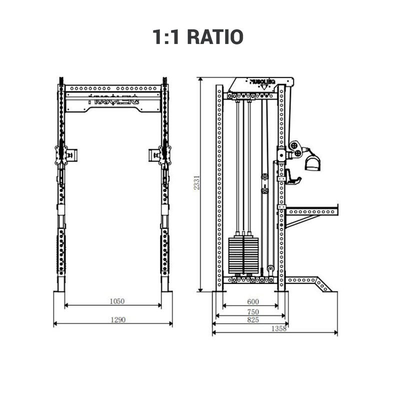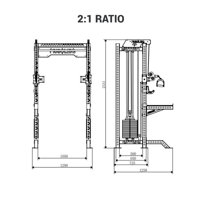 A 1:1 ratio you would be lifting the full weight loaded onto the carriage 20kg feels like 20kg. A 2:1 ratio the weight being lifted is half of the weight loaded onto the plate carriage or weight stack 20kg feels like 10kg. This system adapts to any training need. Whether you're focusing on compound lifts, isolated movements, or full-body sessions, this rack delivers elite versatility in a compact footprint.